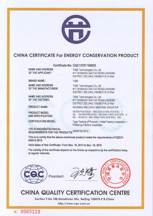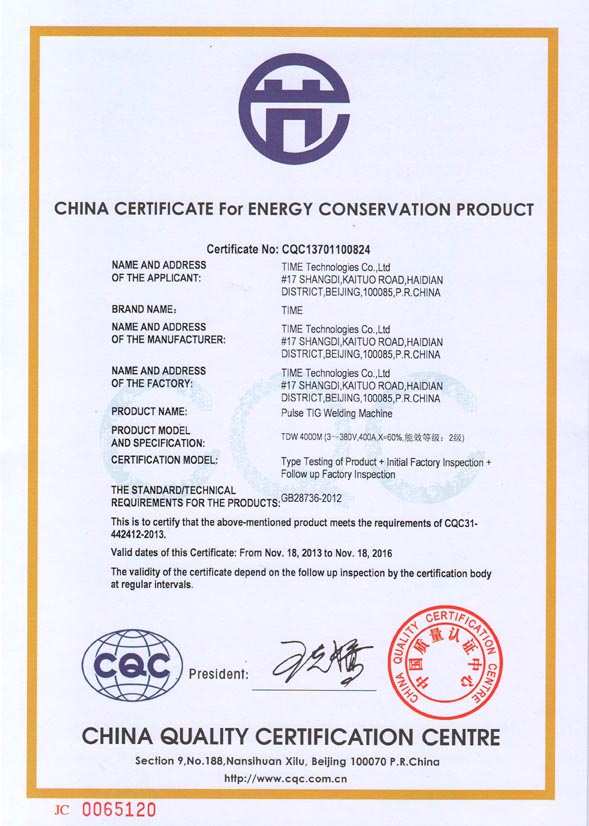 2013-11 China Certificate For Energy Conservation Product (Pulse Tig) China Quality Certification Center