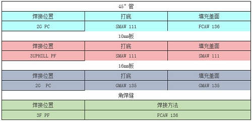 組合件包含管、10mm板、16mm板和角焊縫四個試件。焊接完成后進行外觀檢查、折斷檢驗、射線探傷。四個試件的焊接方法和焊接位置在賽前從下表中抽取確定。